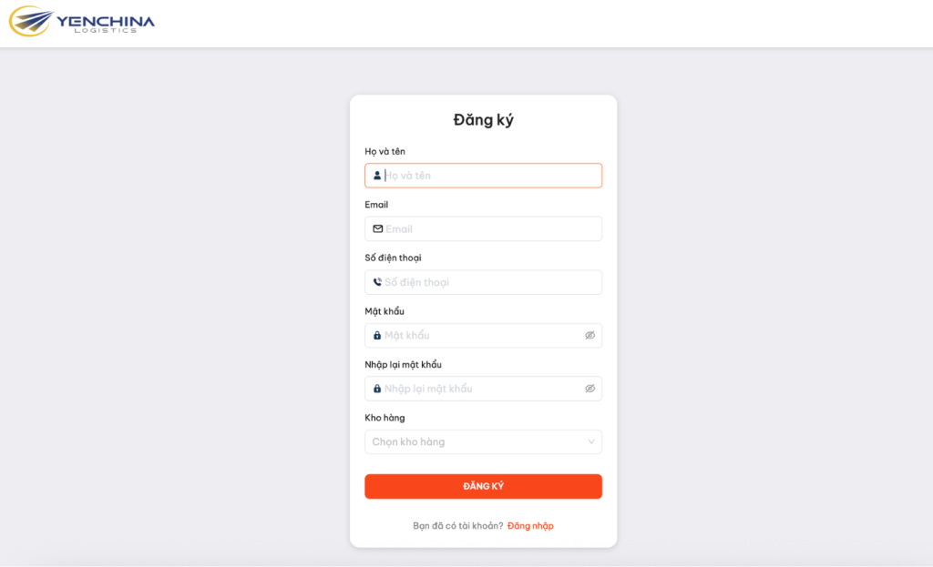 Bạn truy cập vào website chính thức của Yến China Logistic và nhấn chọn “Đăng ký” ở tiến hành tạo tài khoản user. Lúc này, hệ thống sẽ tự động chuyển sang trang đăng ký với yêu cầu nhập đầy đủ và chính xác các thông tin cá nhân cần thiết như: Họ tên, Mật khẩu, SĐT, Email,… Tiếp theo, bạn nhấn chọn khung chữ “Đăng ký” để tạo tài khoản thành công.