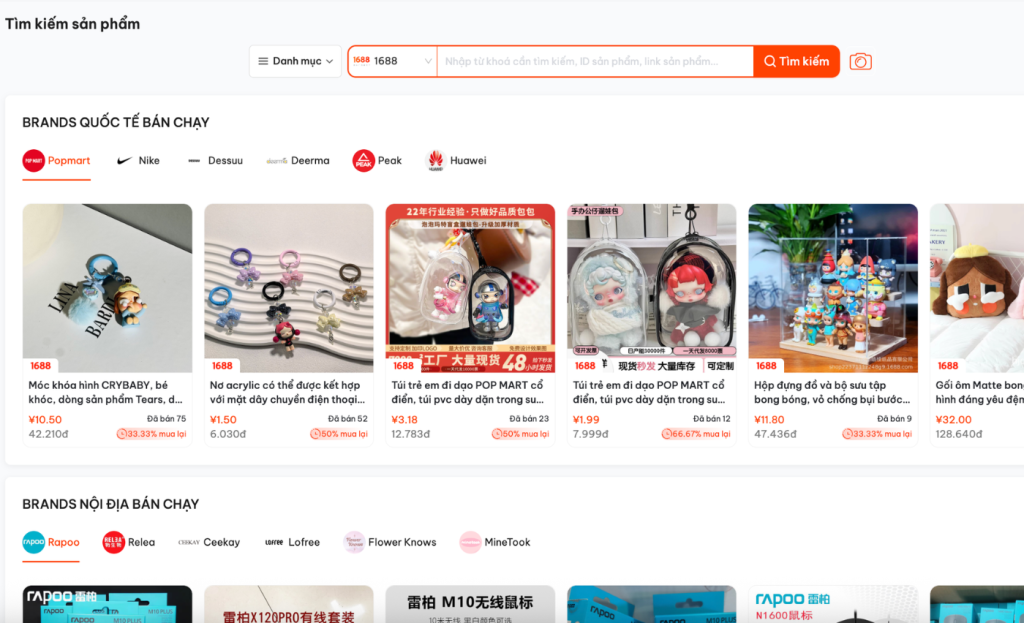 - Cách 2: Tìm kiếm bằng từ khóa tiếng Việt. Bạn chỉ cần chọn nền tảng (Taobao, 1688, Tmall), sau đó nhập từ khóa để hệ thống gợi ý sản phẩm phù hợp.