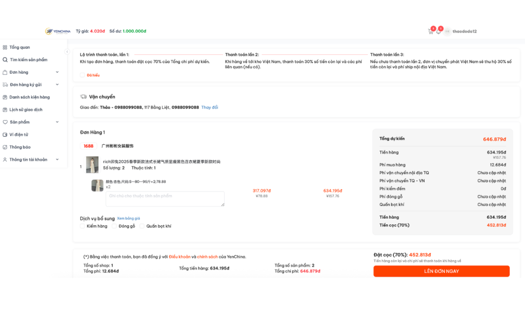 Bạn có thể kiểm tra lại thông tin sản phẩm, điều chỉnh địa chỉ nhận hàng hoặc lựa chọn thêm các dịch vụ bổ sung như kiểm hàng, đóng gỗ tùy theo nhu cầu. Sau khi xác nhận đầy đủ thông tin, bạn nhấn “Lên đơn ngay” để tạo đơn hàng.
