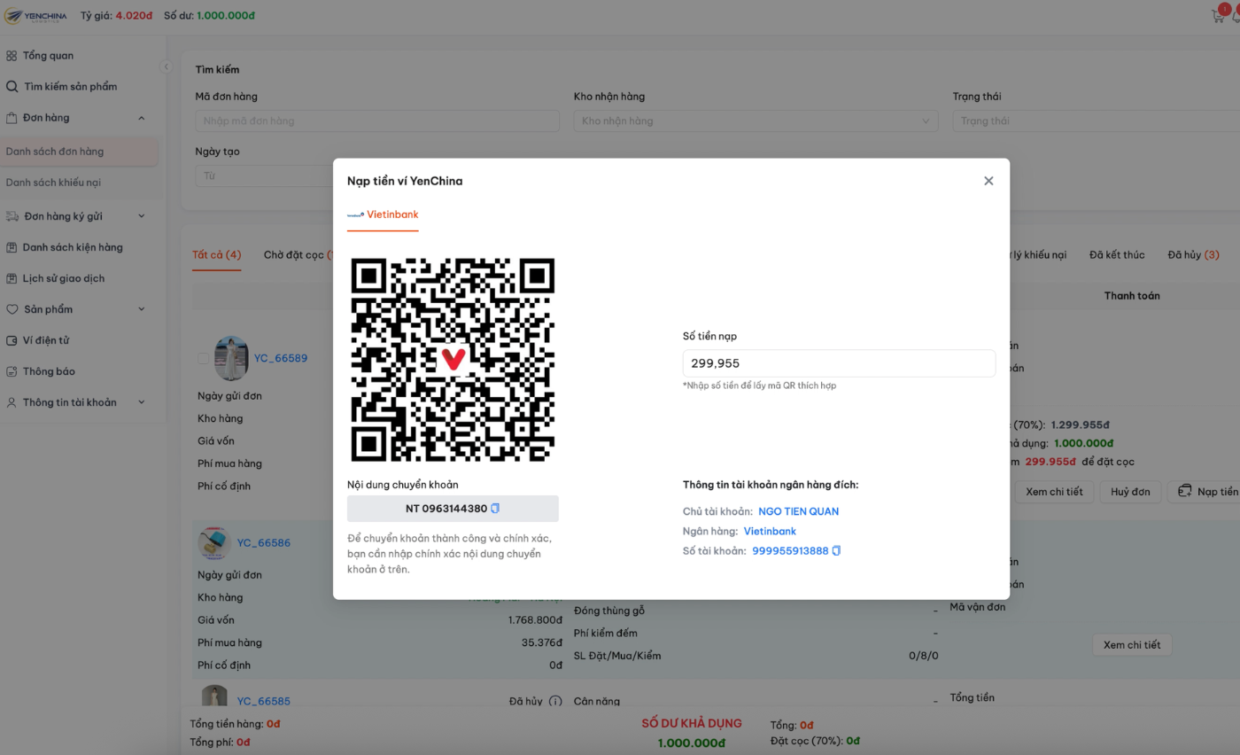 Để đơn hàng được xử lý, bạn cần tiến hành đặt cọc. Nhấn vào “Nạp tiền”, trên màn hình sẽ hiện lên số tiền cần nạp. Sau đó, sử dụng ứng dụng ngân hàng để quét mã QR Code và hoàn tất thanh toán.